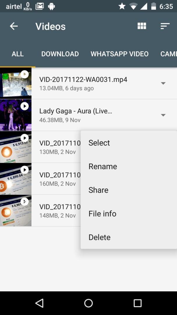 Moreover, other operations you can perform on media stored on your device with Files is also basic, such as Rename, File-Info, share, select all and delete. Hiding files, changing their extensions and no such advanced options can be found here, only the essentials are seen here.