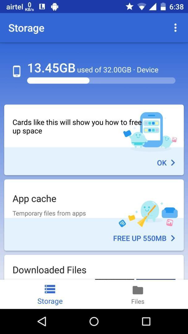 At the top-most area, you’ll see your Storage space remaining out of total space available on your device’s internal as well as on your SD-card and below that, you’ll get a variety of cards by the app itself which will show you how you can free up space on your device, such as: